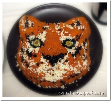 Мы сегодня спали аж до 11! Вчера дети поддались общему настроению и я их не могла до 3 утра уложить. И как они только не устали, ведь столько впечатлений: и подарки и стол необычно накрывали. А как они мне готовить помогали!!! :))) Это они улучили момент когда мама отошла, а когда вернулась через минуту, то обнаружила, что все вареные яйца, которые дети мило перекладывали с тарелочки на тарелочку, теперь оказались на полу и дети усердно перетирают их в порошок! :))) пришлось яйца доваривать :) А вот еще один результат совместного творчества – салат “Тигр”. В самый последний момент увидела идею в Английской Гостиной (рецепт ТУТ) и решила сделать. дети с удовольствием крошили маслины. Прямо руками :))) А потом с удовольствием поджидали момент когда мама отвернется, чтобы сковырять с тигриной морды лица весь макияж :)))) Есть салат они наотрез отказались… Да и вообще от новогодних угощений тоже. Даже от тех, которые я делала специально для них - сидели за столом и жевали хлебушек как бедные родственники :)))